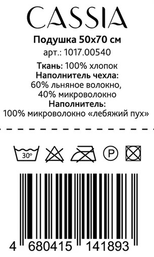 Подушка Cassia альпийский лен и хлопок, размером 70 x 70 см, имеет чехол из 100% хлопка. Наполнитель чехла состоит из 60% льна и 40% микроволокна, а внутренний наполнитель ядра подушки - 100% микроволокно лебяжий пух.
