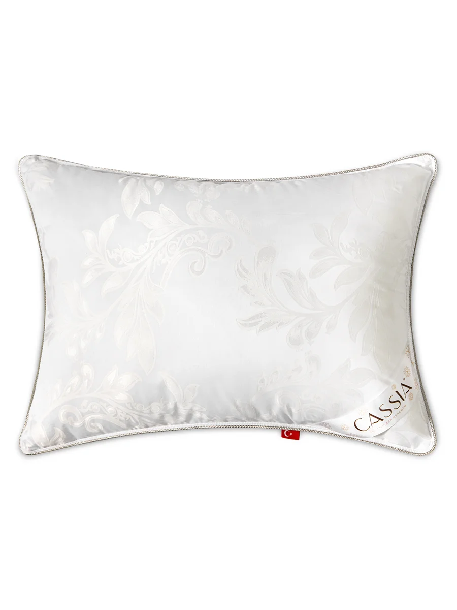 Микрогель Airsoft - инновационный наполнитель, который отличается формоустойчивостью и долговечностью, не вызывает аллергии. Особая конструкция этого полого внутри волокна создает объем и воздушность, которые сохраняются на протяжении всего срока службы изделия. Дополнительный объем и особую упругость подушке придает вставка из специальной ткани, вшитая по периметру изделия, которая служит пружинящим элементом и способствует отличному воздухообмену. Жаккард - достаточно плотный материал из натурального хлопка и вискозы жаккардового переплетения, который обладает легким блеском и объемным рисунком. Такая ткань гипоаллергенная, гигроскопичная, износостойкая. Она выглядит элегантно благодаря своему составу. Изделие на основе вискозного волокна - универсальный всесезонный вариант, который обладает антистатическими и антибактериальными свойствами, улучшает обмен веществ, нормализует кровообращение спящего человека. Подушка окантована плетеным серебряным кантом, который украшает и позволяет ей дольше держать форму.
