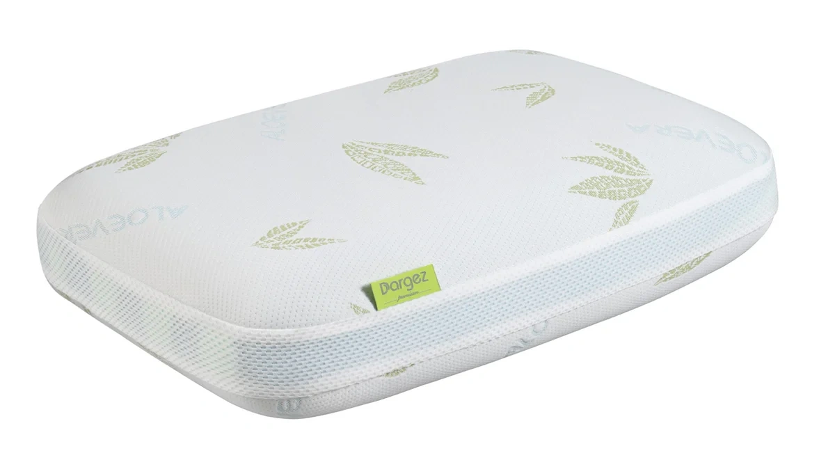 Подушка Dargez Climate Control эргономичная, 38 x 58 x 13 см подойдет как женщинам, так и мужчинам, Съемный чехол на молнии из трикотажного полотна с пропиткой алоэ вера обогащает клетки организма витаминами, расслабляет мышцы и обладает релаксирующим действием. Изделие помогает коже удерживать влагу, нежно ухаживая за ней, обладает антисептическими и противовоспалительными свойствами, нормализует работу всех обменных процессов, повышая общий тонус организма. Вшитый бортик из 3D-сетки способствует дополнительному воздухообмену. Форма подушки состоит из двух зон. Одна сторона (лето) обладает охлаждающим эффектом, что обеспечивает повышенный воздухообмен, отведение тепла, делает поверхность прохладной, при этом испаряет влагу, поддерживает оптимальную температуру головы. Вторая сторона (зима) отличается повышенной мягкостью: хорошо сохраняет тепло, идеально повторяет контуры головы. Подушка упакована в красивую коробку с ручкой, что делает ее отличным подарком на любой праздник.