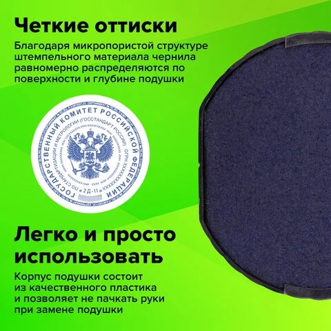 Подушка заправлена синими чернилами, которые благодаря микропористой структуре штемпельного материала равномерно распределяются по поверхности и глубине. Корпус подушки состоит из качественного пластика, который позволяет не пачкать руки при замене подушки. Срок годности составляет 6 лет (дата изготовления указана на промежуточной упаковке).