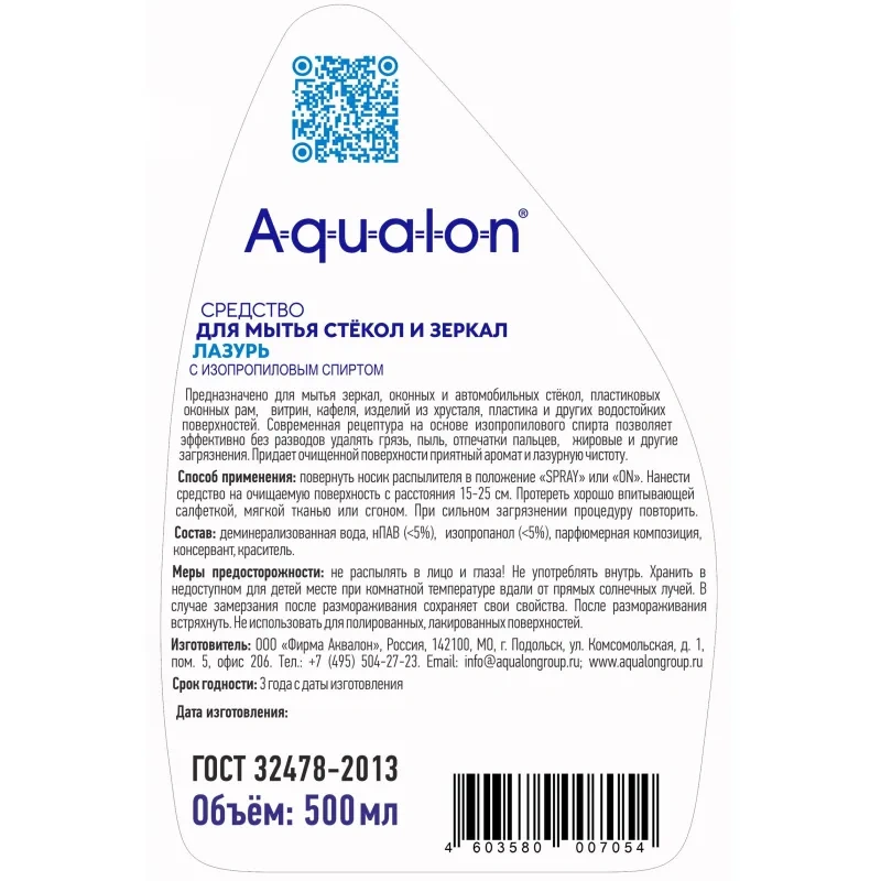 Средство для стекол и зеркал АQUALON Лазурь, 500 мл
