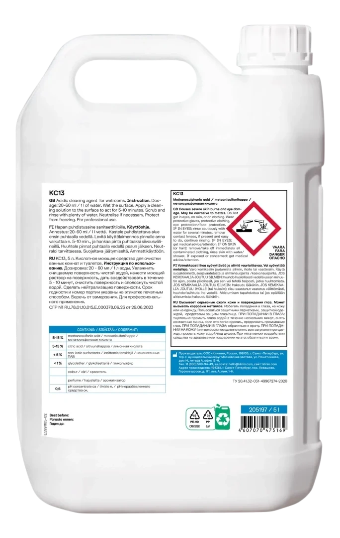 Моющее средство для сантехники Klinin КС13 5л, слабокислое, 205197