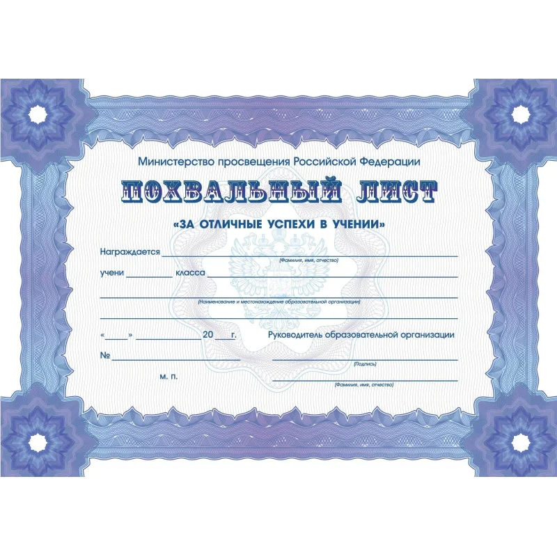 Похвальный лист За успехи в учебе МП РФ А4 250 г/кв. м синяя рамка (10 штук в упаковке). Бланк имеет сине-фиолетовую ажурную рамку, светлый фон и напечатанную структуру заполнения. Сверху расположен российский герб, придающий бланку торжественный официальный вид. Похвальный лист предназначен для награждения школьников начальной, средней и старшей школы за особые заслуги в учебе — окончание учебного года с отличием. Лист изготовлен из мелованного картона плотностью 250 г/кв. м. Формат — А4. Подходит для печати на принтере, перед печатью необходимо установить режим Плотная бумага. В упаковке 10 шт.