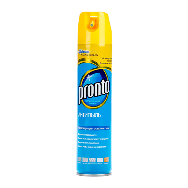 Полироль для мебели Pronto 'Антипыль' содержит эффективную формулу, которая легко очищает, удаляет следы пальцев и загрязнения со всех поверхностей: от дерева до стекла.