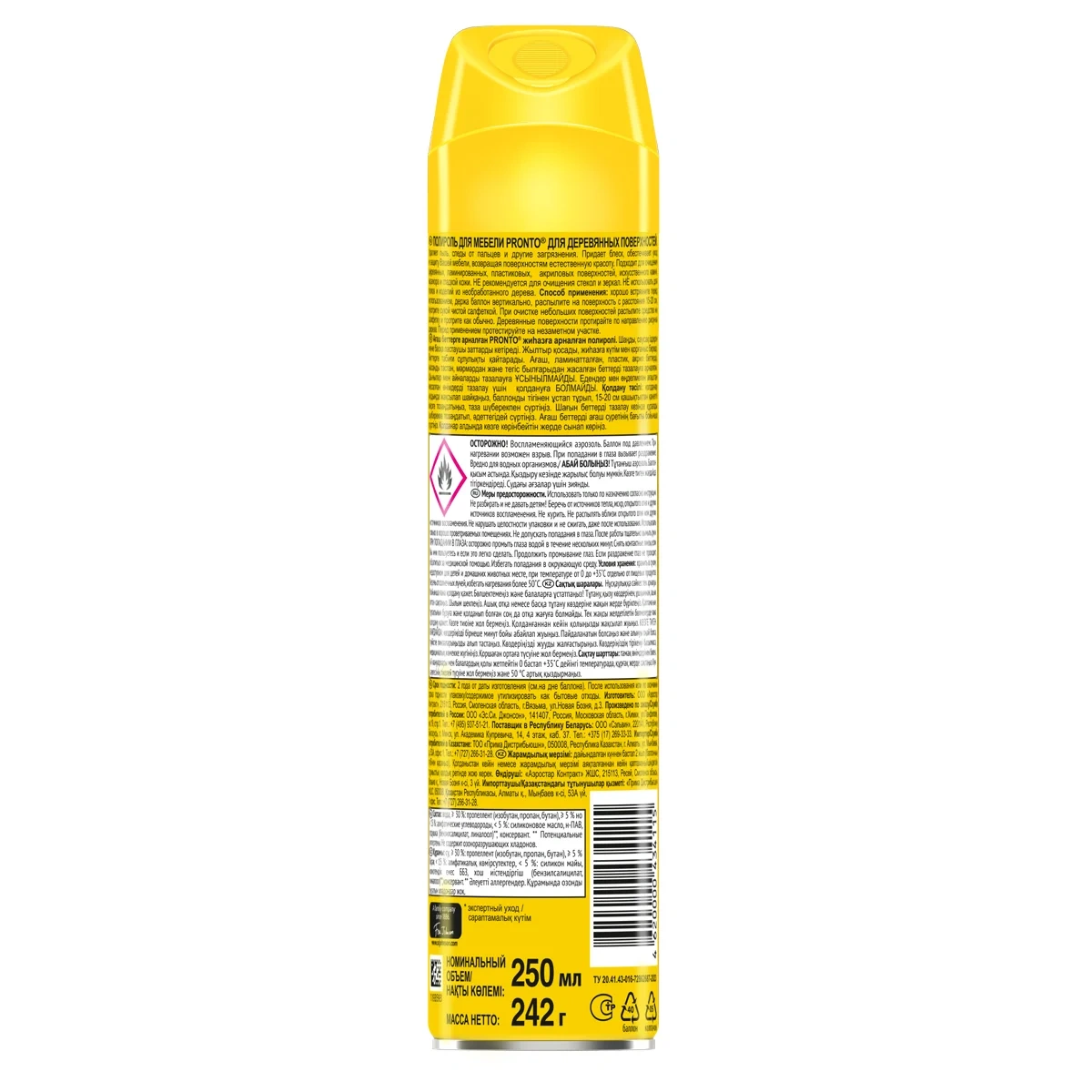 Полироль для мебели Pronto Для деревянных поверхностей, 250 мл Назначение: Средство для ухода за мебелью и прочими поверхностями. Удаляет пыль, следы от пальцев и другие загрязнения. Придает блеск, обеспечивает уход и защиту Вашей мебели, возвращая поверхностям естественную красоту. Подходит для очищения деревянных, ламинированных, пластиковых, акриловых поверхностей, искусственного камня, мрамора и гладкой кожи. НЕ рекомендуется для очищения стекол и зеркал. НЕ использовать для полов и изделий из необработанного дерева. Способ применения: Хорошо встряхните перед использованием, держа баллон вертикально, распылите на поверхность с расстояния 15-20 см, протрите сухой чистой салфеткой. При очистке небольших поверхностей распылите средство на салфетку и протрите как обычно. Деревянные поверхности протирайте по направлению рисунка дерева. Перед применением протестируйте на незаметном участке. Меры предосторожности: Использовать только по назначению согласно инструкции. Не разбирать и не давать детям! Беречь от источников тепла, искр, открытого огня и других источников воспламенения. Не курить. Не распылять вблизи открытого огня или других источников воспламенения, Не нарушать целостности упаковки и не сжигать, даже после использования. Использовать только в хорошо проветриваемых помещениях. Не допускать попадания в глаза. После работы тщательно вымыть руки. При попадании в глаза: осторожно промыть глаза водой в течение нескольких минут. Снять контактные линзы, если Вы ими пользуетесь и если это легко сделать. Продолжить промывание глаз. Если раздражение глаз не проходит, обратиться за медицинской помощью. Избегать попадания в окружающую среду. Состав: Вода, ? 30 %: пропеллент (изобутан, пропан, бутан), ? 5 % но < 15 %: алифатические углеводороды, < 5 %: силиконовое масло, н-ПАВ, отдушка (бензилсалицилат, линалоол)xx, консервант. xx Потенциальные аллергены. Не содержит озоноразрушающих хладонов. Условия хранения: Хранить в сухом, недоступном для детей и домашних животных месте, при температуре от 0 до +35C отдельно от пищевых продуктов. Беречь от солнечных лучей, избегать нагревания более 50C. Срок годности: 2 года (с даты производства)