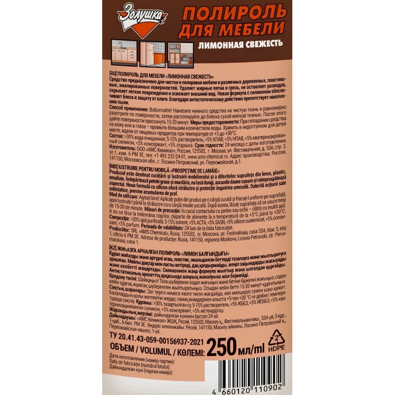 Назначение. Средство предназначено для ухода за полированной и неполированной мебелью, а также для чистки и полировки мебели и различных деревянных, пластиковых, лакированных и окрашенных поверхностей. Легко удаляет жирные пятна и грязь, следы от пальцев, скрывает легкие повреждения и освежает внешний вид. Усиленная формула с силиконом обеспечивает блеск и защиту от влаги и пыли. Благодаря антистатическому и антиадгезионному действию полироль препятствует накоплению пыли.