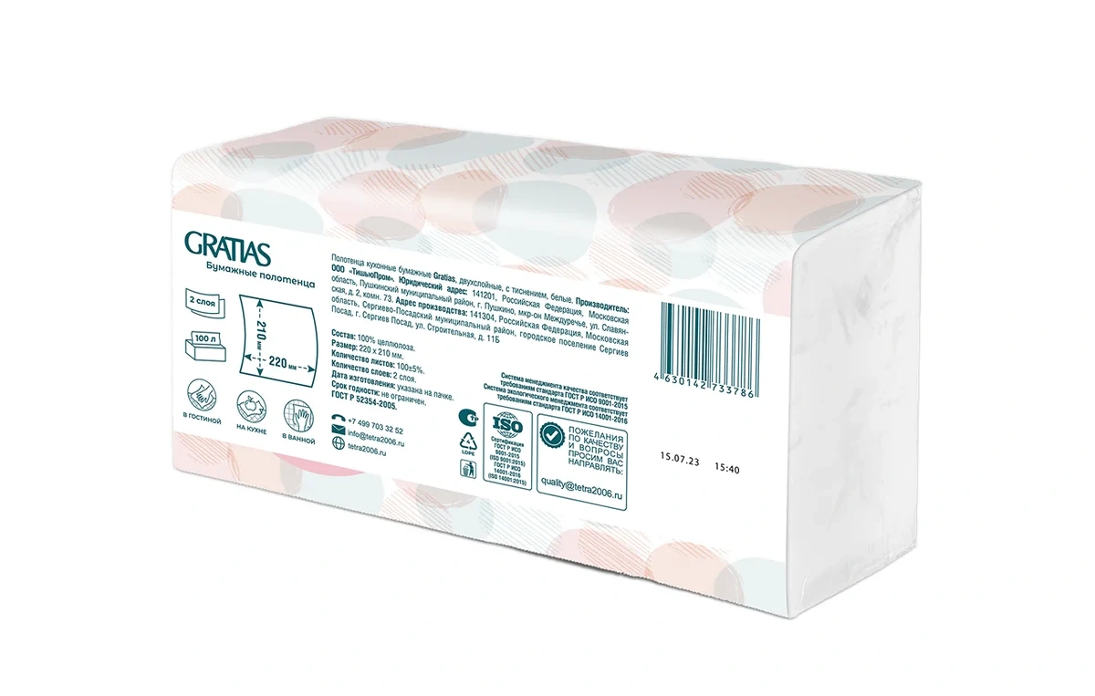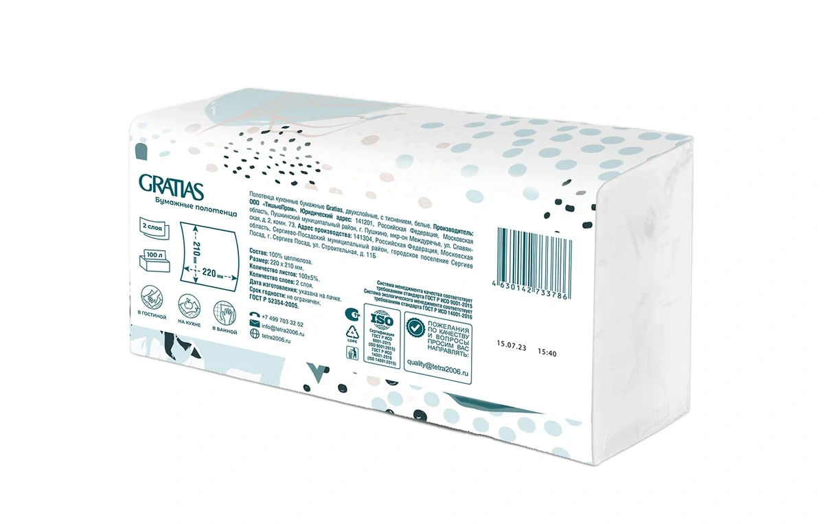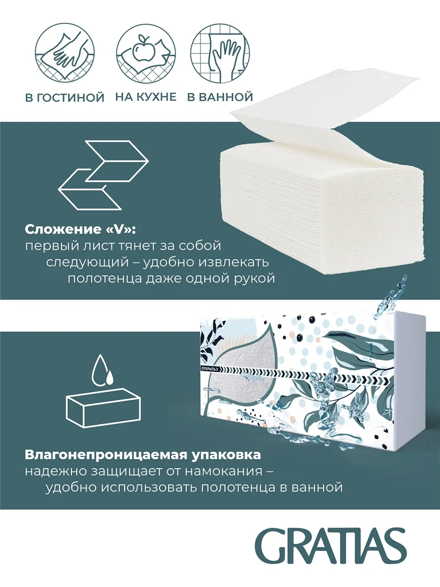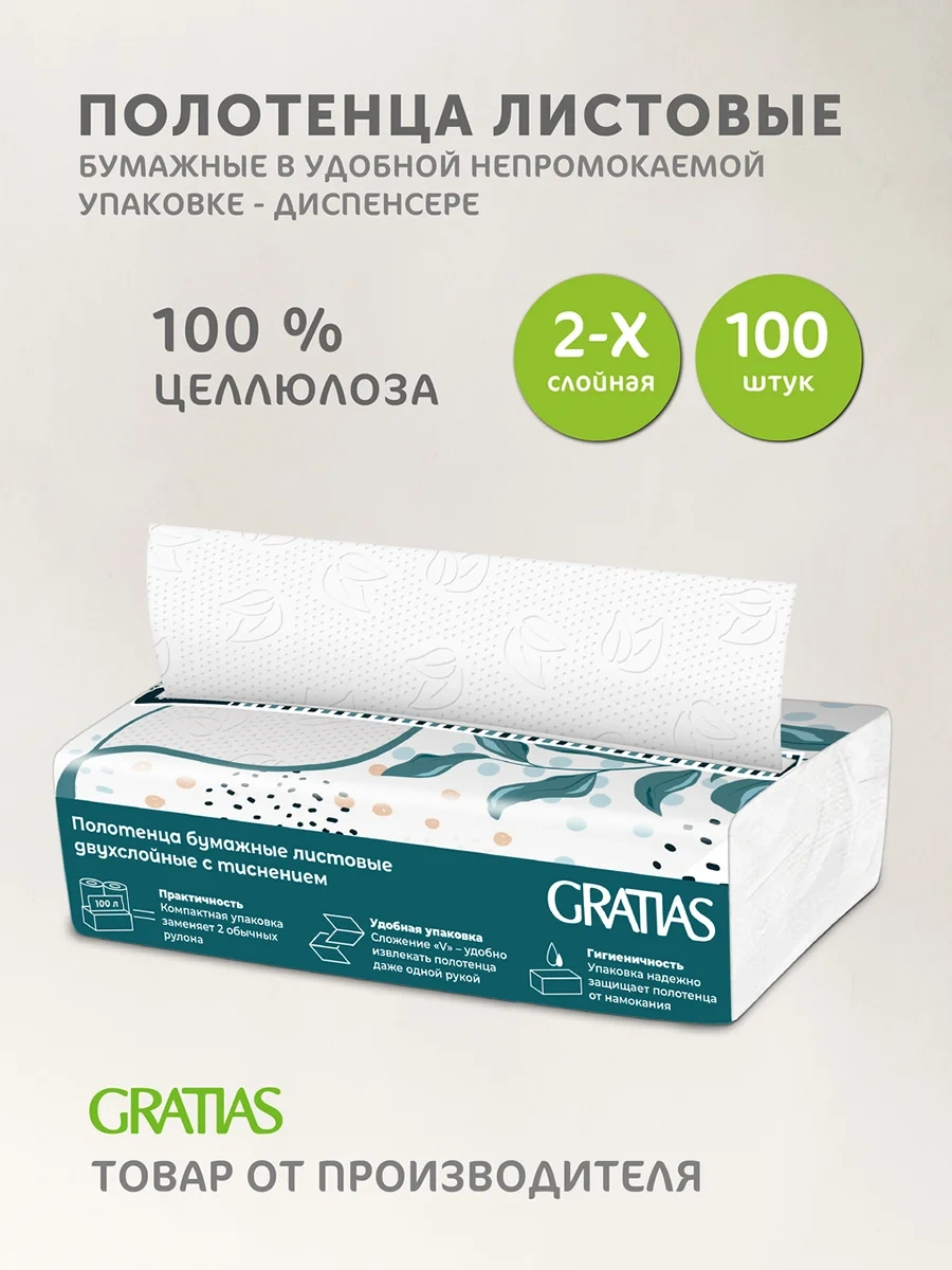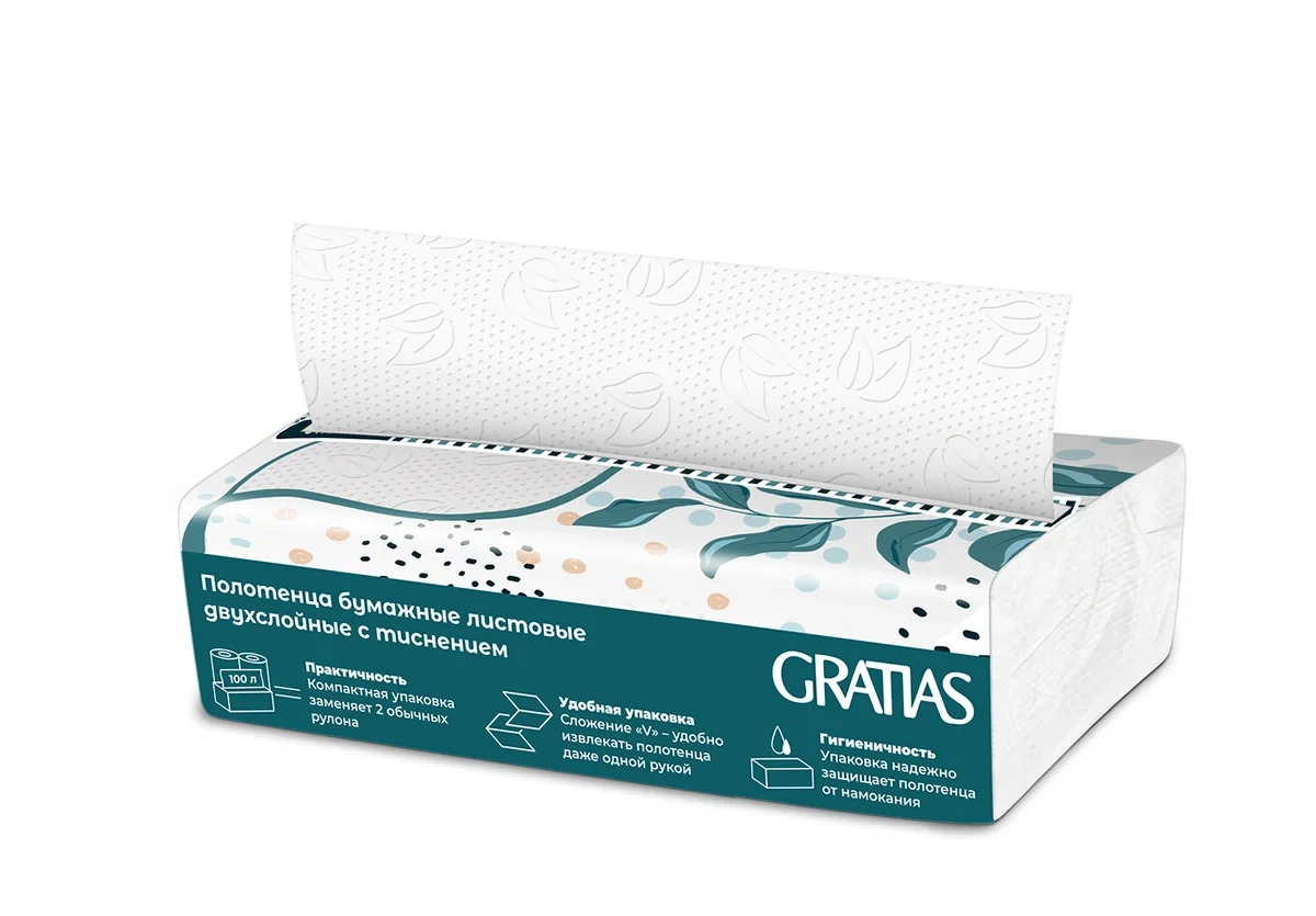 Полотенца бумажные Gratias V-сложения двуслойные, 100шт