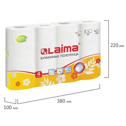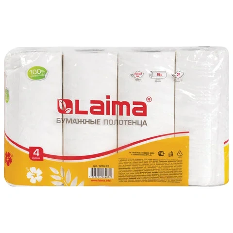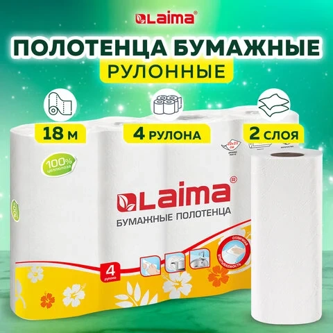 Полотенца бумажные Лайма 2-х слойные, белые, 18м, 4 рулона