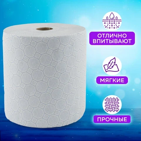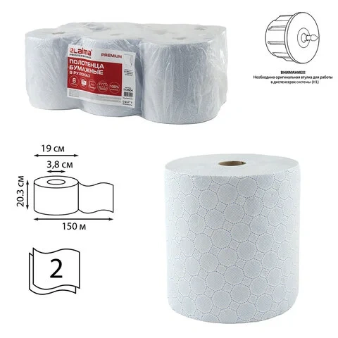 Мягкие, с хорошей впитываемостью. Обеспечивают экономичный расход. Изготовлены из 100% целлюлозы. Имеют два слоя, с тиснением. Длина намотки - 150 м. Применяются в диспенсерах системы TORK H1. 6 рулонов в спайке.