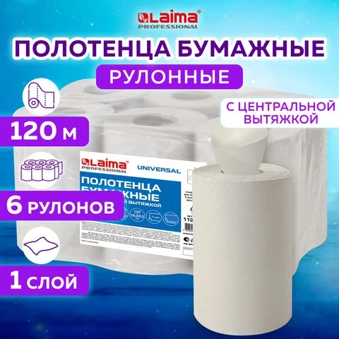 Бумажные полотенца Laima Universal M1, в рулоне, 1 слой, 120м, белые, 6 рулонов