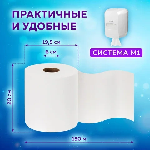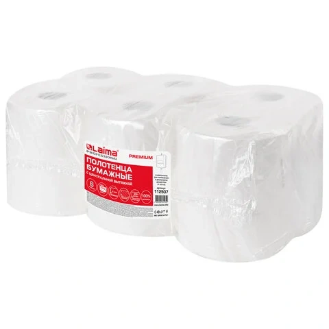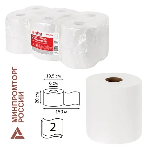 Бумажные полотенца Laima Premium M2, в рулоне с центр. вытяжкой, 2 слоя, 150м, белые, 6 рулонов
