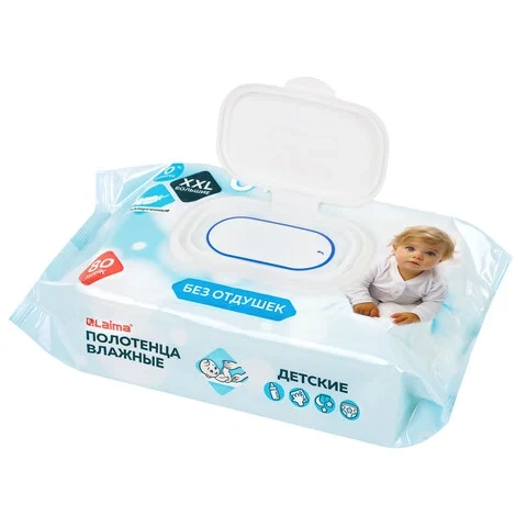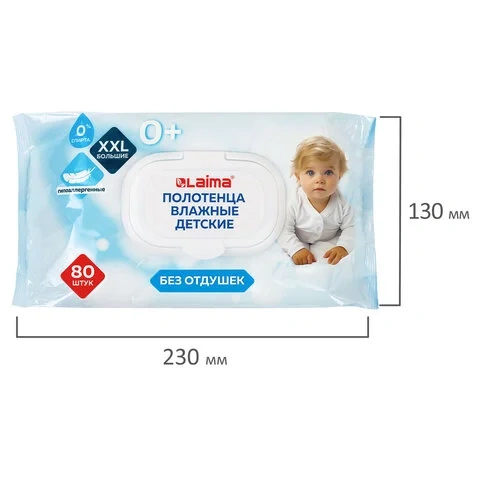 Полотенца влажные детские гипоаллергенные 80 шт., БОЛЬШИЕ XXL 16,5х25 см, без отдушки, LAIMA Kids, 1