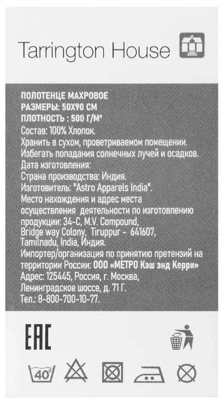 Tarrington House Полотенце хлопок бежевое махровое 500 г/м2, 50 х 90см