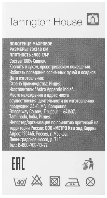 Tarrington House Полотенце махровое белое 500г, 90 x 150см