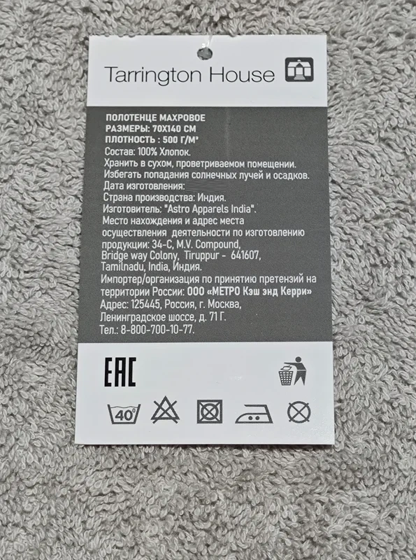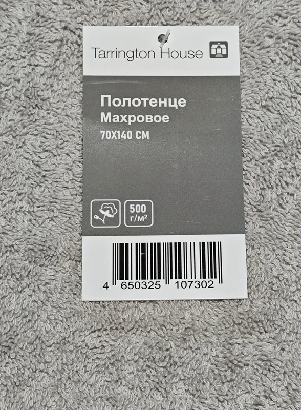 Tarrington House Полотенце хлопок серое махровое 500 г/м2, 70 х 140см