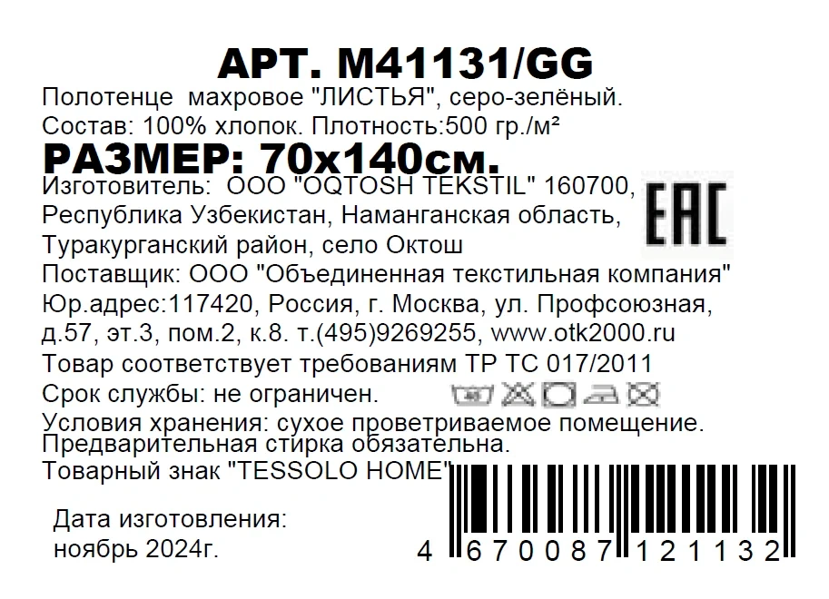 Полотенце Tessolo Home Листья махровое серо-зеленое 500г, 70 x 140см