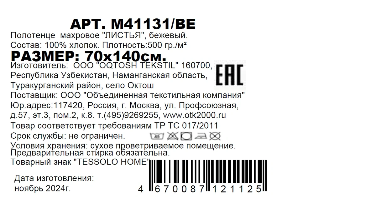 Полотенце Tessolo Home Листья махровое бежевое 500г, 70 x 140см