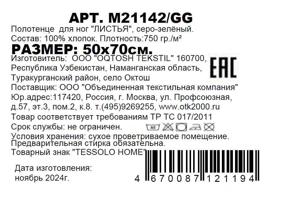 Полотенце для ног Tessolo Home махровое серо-зеленое 750г, 50 x 70см