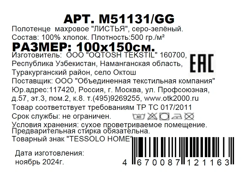 | Комплектация | полотенце - 1 шт. 100х150см |