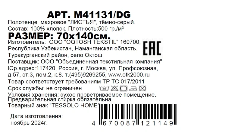 | Комплектация | полотенце - 1 шт. 70х140см |