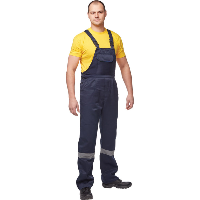 Спецодежда летняя полукомбинезон мужской л03-ПК (размер 64-66, рост 194-200) синего цвета. Предназначен для работников коммунальных и хозяйственных служб. Изготовлен из смесовой ткани с водоотталкивающей пропиткой (68% полиэфир, 32% хлопок), плотность ткани — 220 г/кв.м. Полукомбинезон с застежкой на пуговицы, нагрудным карманом с клапаном и двумя накладными боковыми карманами. Сигнальные элементы выполнены из световозвращающего материала.Соответствует стандарту ГОСТ 27575-87