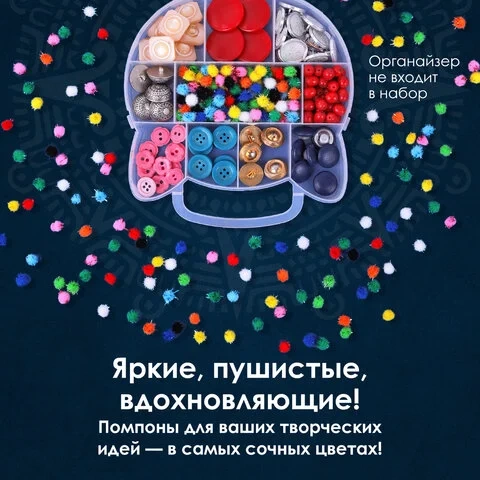 Помпоны для творчества, блестящие, 10 цветов, 8 мм, 60 шт., ОСТРОВ СОКРОВИЩ, 661423