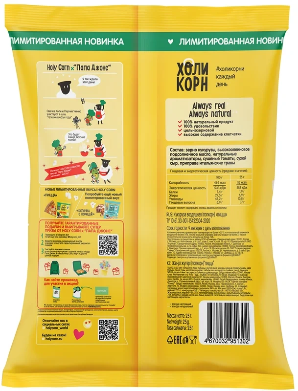 Попкорн Holy Corn Пицца Папа Джонс, 25г
