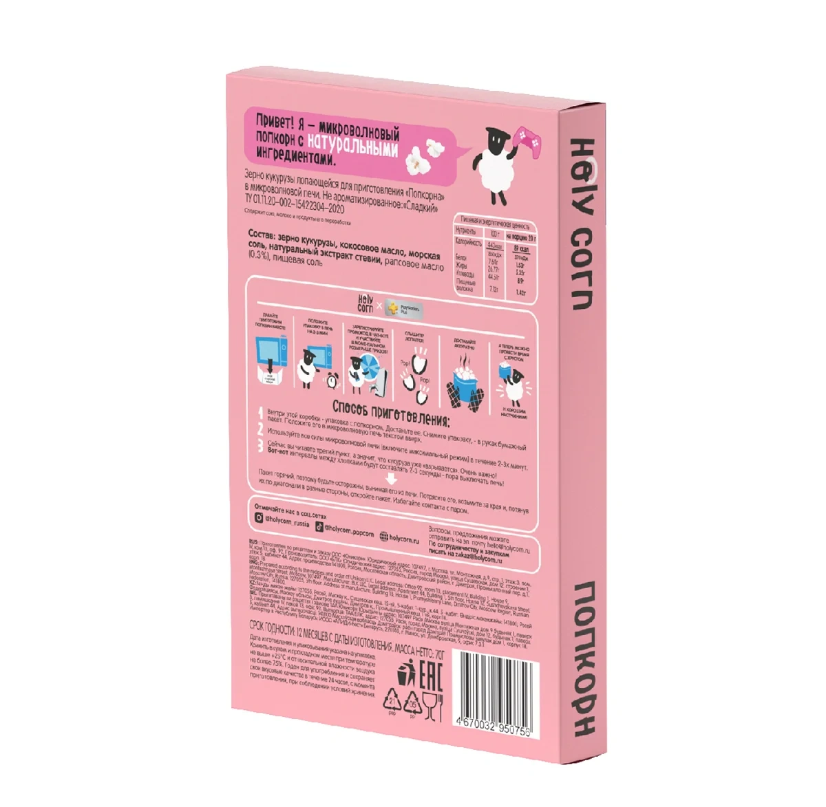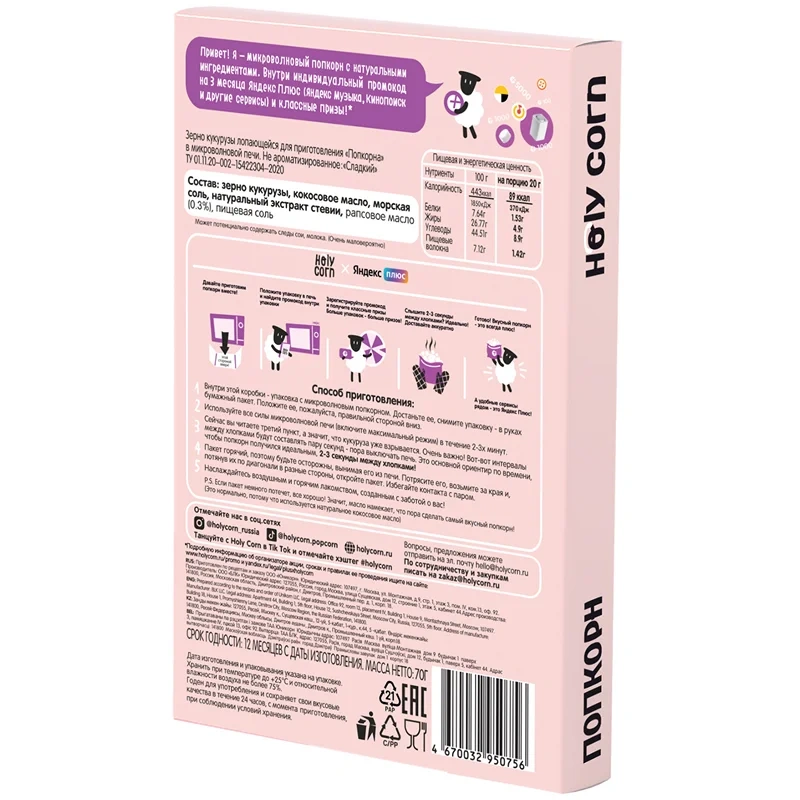 Попкорн Holy Corn сладкий для приготовления в микроволновой печи, 70г
