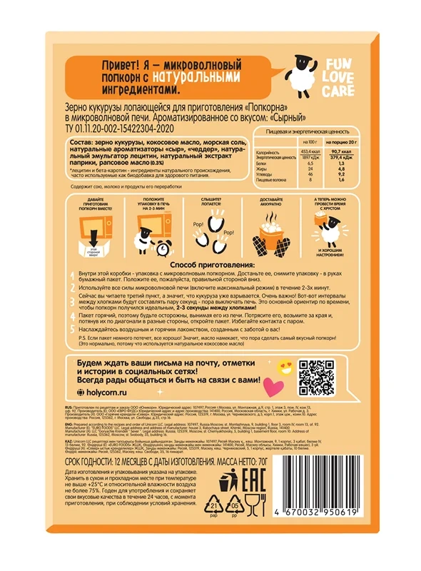 Попкорн микроволновый Holy Corn Нежный сыр, 70г