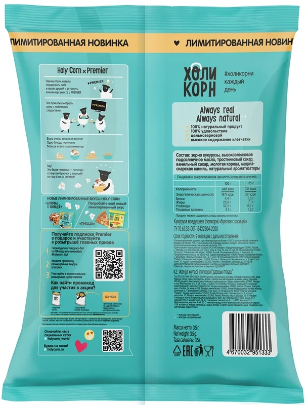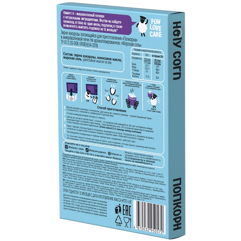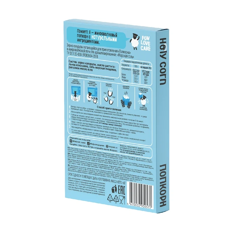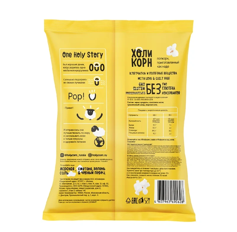 Попкорн Holy Corn морская соль для приготовления в микроволновой печи, 65г