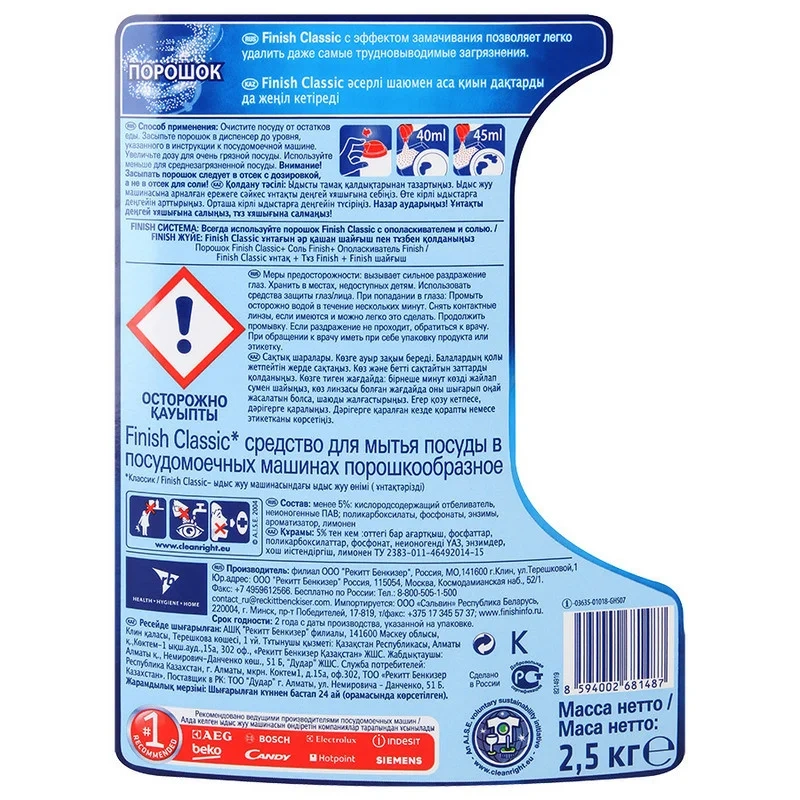 Порошок для посудомоечных машин Finish Classic - это экономичное решение для чистоты вашей посуды. Эффективное очищение, Эффект замачивания, возможность дозирования в зависимости от степени загрязнения посуды, удобно дозировать для коротких циклов. Состав: менее 5%: кислородосодержащий отбеливатель, неионогенные ПАВ; поликарбоксилаты, фосфонаты, энзимы, ароматизатор, лимонен. Хранить в недоступных для детей местах. Не допускать попадания в глаза. При попадании в глаза тщательно промыть водой. При случайном проглатывании обратиться к врачу. Вызывает серьезное раздражение глаз. Может вызвать аллергическую реакцию. Использовать средства защиты глаз. При попадании в глаза осторожно промойте их водой в течение нескольких минут. При наличии контактных лизн, снимите их (если это возможно). Продолжайте промывать глаза. Если раздражение не проходит, обратитесь к врачу. При обращении к врачу возьмите с собой упаковку или этикетку. Не глотать. При попадании в полость рта обратитесь к врачу. Закрывайте упаковку должным образом, храните вдали от источников тепла и влаги. Очистите посуду от остатков еды. Засыпьте порошок в диспенсер до уровня, указанного в инструкции к посудомоечной машине. Увеличьте дозу для очень грязной посуды. Используйте меньше средства для менее загрязненной посуды. Внимание! Засыпать порошок следует в отсек с дозировкой, а не в отсек для соли! Всегда используйте порошок Finish Classic с ополаскивателем и солью.