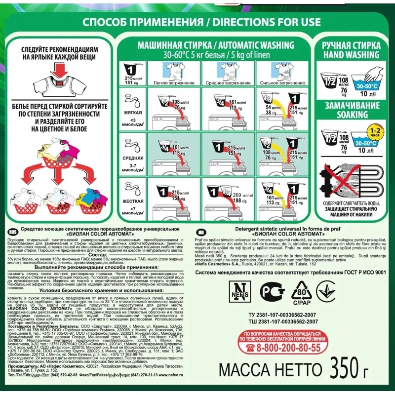 Способ применения: замачивайте и стирайте бельё в тёплой воде после полного растворения порошка (подробная информация о дозировке указана на упаковке). Замачивать не дольше 2 часов. Прополощите бельё тёплой, а затем холодной водой до исчезновения пены. Рекомендованная температура стирки указана на ярлыках текстильных изделий.