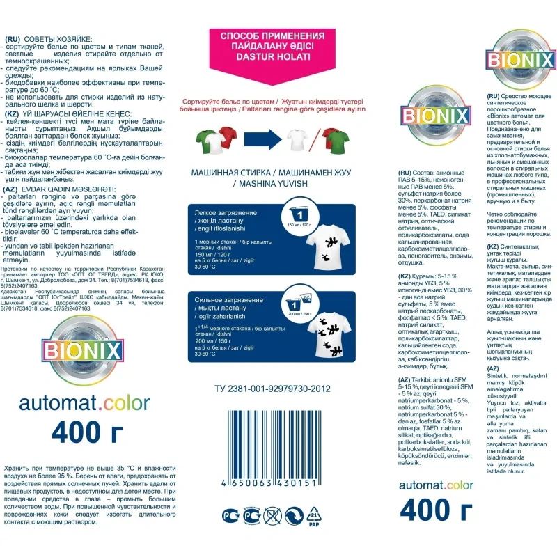 Назначение: для цветного белья для замачивания, предварительной и основной стирки белья из хлопчатобумажных, льняных и смешанных волокон в стиральных машинах любого типа, в профессиональных стиральных машинах (промышленных), вручную и в быту.