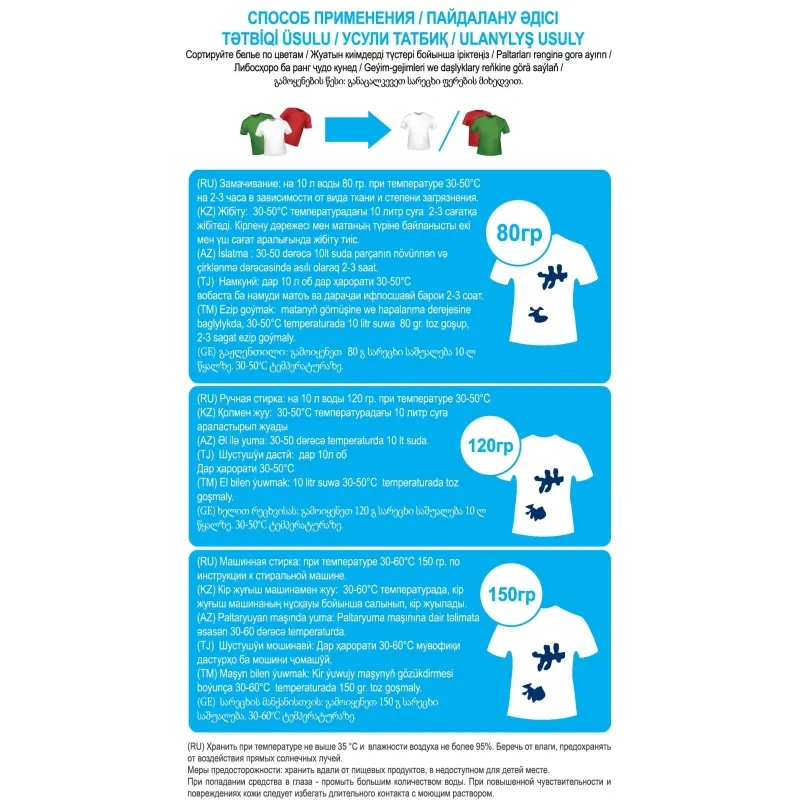 Ручная стирка: на 10 л воды 120 гр при температуре 30-50 °С.