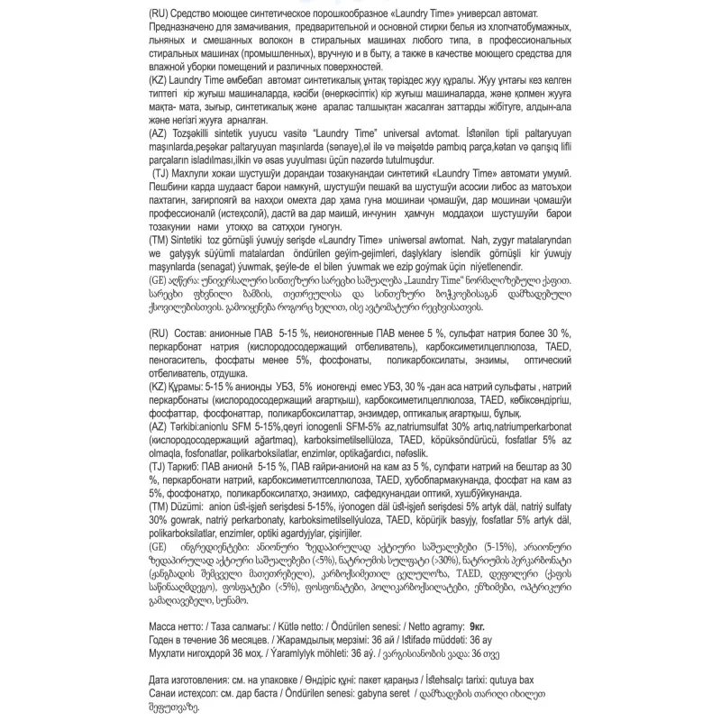 Назначение: для замачивания, предварительной и основной стирки белья из хлопчатобумажных, льняных и смешанных волокон в стиральных машинах любого типа, в профессиональных стиральных машинах (промышленных), вручную и в быту, как моющее средство для влажной уборки помещений и различных поверхностей.