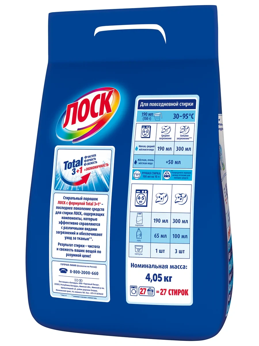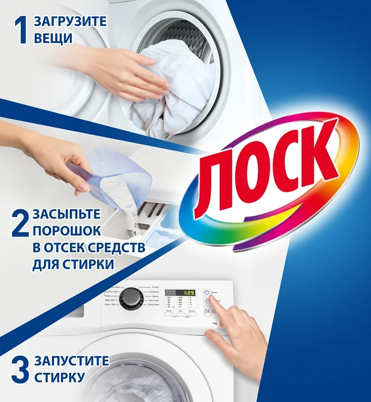 Порошок для стирки Лоск Горное озеро: отстирывает даже сложные пятна; сохраняет белизну и сияние вещей; дарит вещам приятный аромат; работает в стиральных машинах любого типа и в воде любой жесткости; эффективен уже при 30C; не содержит фосфатов и хлорных соединений, безопасен для окружающей среды и кожи человека; 100 % перерабатываемая упаковка.