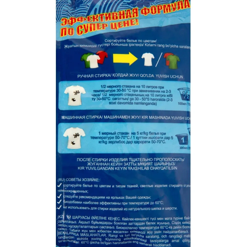 Назначение: для замачивания, стирки изделий из хлопчатобумажных, льняных и синтетических волокон в стиральных машинах любого типа и вручную.