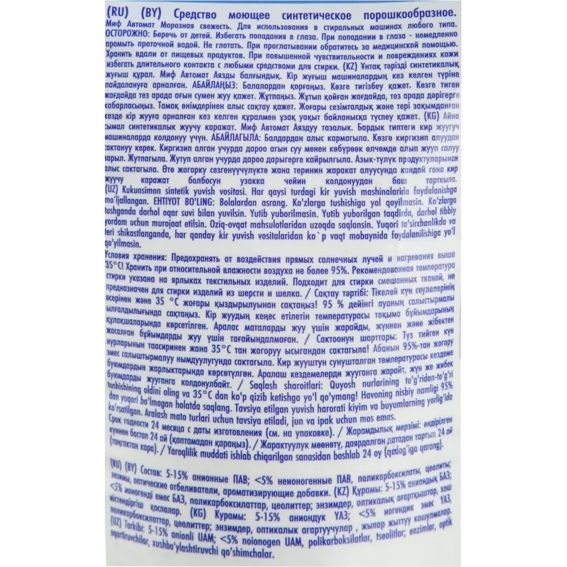 Состав: сульфат натрия (30% и более), карбонат натрия (5% и более, но менее 15%), ПАВ (менее 5%), комплексообразователь (менее 5%), отдушка (менее 5%).