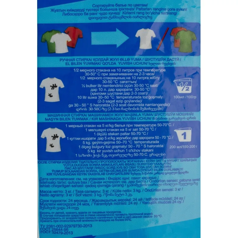 Машинная стирка: 1 мерный стакан/200 мл/150—200 г на 5 кг белья при температуре 50–70 °С.
