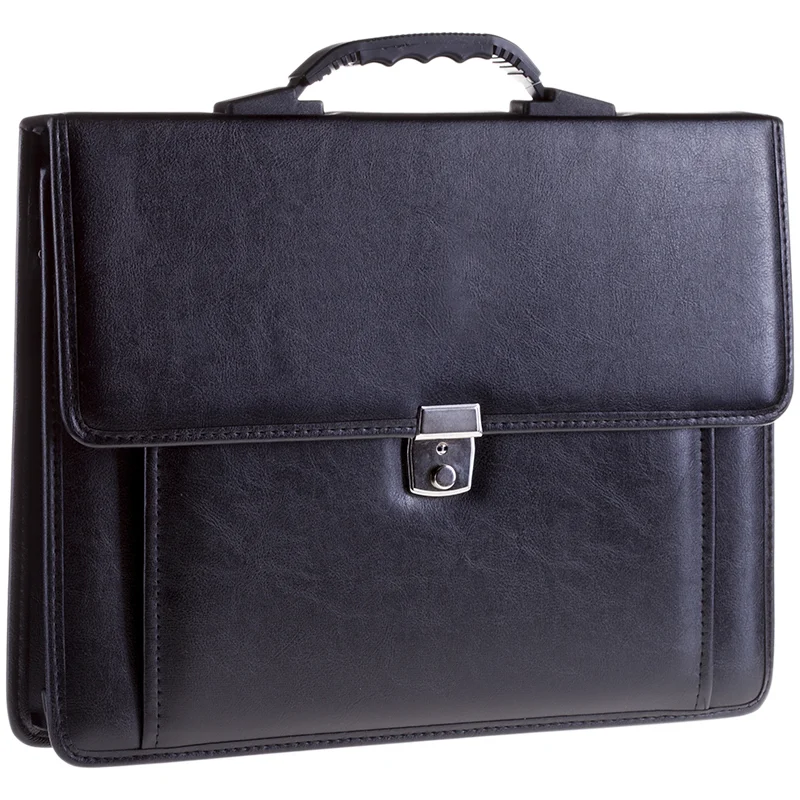 Мужской деловой портфель из искусственной кожи OfficeSpace Rotterdam чёрного цвета. Размер: 380*290*85 мм. Портфель закрывается с помощью клапана на замке-защёлке. Внутри три отделения для хранения пишущих принадлежностей и документов.