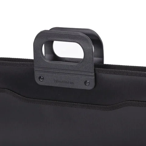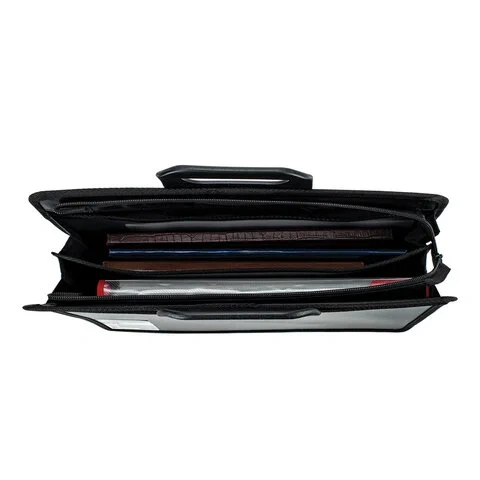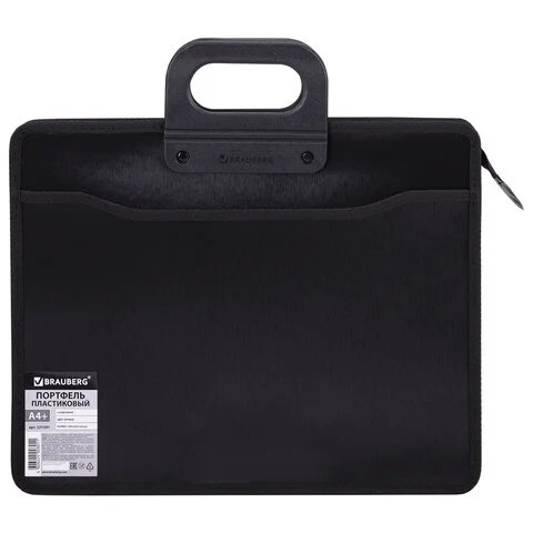 Портфель формата А4+ (390х320х120 мм) изготовлен из плотного пластика толщиной 0,7 мм, выполнен в солидном черном цвете с фактурой 'под дерево' и имеет 4 отделения. Усиленные ручки обеспечивают надежность в процессе эксплуатации. Портфель застегивается на молнию. Края окантованы тканью, что придает изделию презентабельный вид.