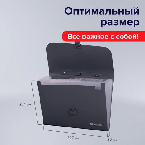 Портфель формата А4 (327х254х30 мм) изготовлен из плотного пластика стандартной фактуры толщиной 0,7 мм, выполнен в солидном темно-сером цвете и имеет 13 отделений с индексными ярлыками. Складная ручка обеспечивает компактность изделия. Портфель застегивается на клапан.