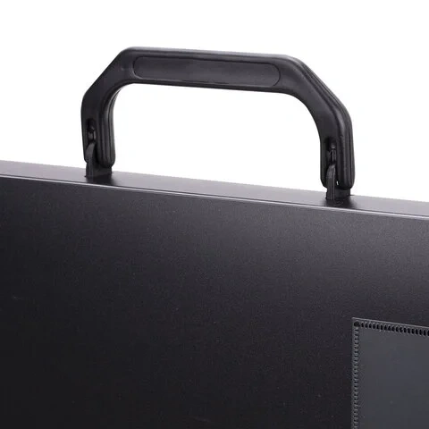 Портфель формата А3 (445х310х30 мм) изготовлен из плотного пластика стандартной фактуры толщиной 0,9 мм, выполнен в солидном черном цвете и имеет 1 отделение и 1 карман. Складная ручка обеспечивает компактность изделия. Портфель застегивается на клапан.
