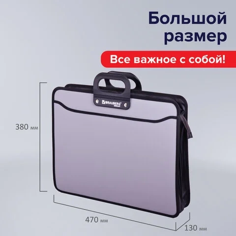Портфель формата А3 (470х380х130 мм) изготовлен из плотного пластика толщиной 1 мм, выполнен в солидном сером цвете с фактурой 'бисер' и имеет 3 отделения и 6 карманов. Усиленные ручки обеспечивают надежность в процессе эксплуатации. Портфель застегивается на молнию. Края окантованы тканью, что придает изделию презентабельный вид.