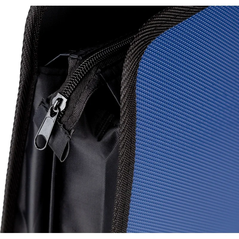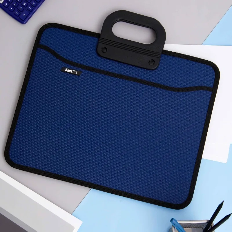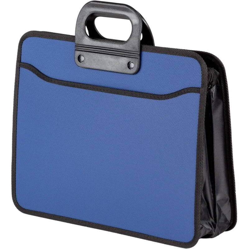 Папка-портфель изготовлена из прочного пластика толщиной 0,9 мм. Габаритные размеры, превышающие стандартные, позволяют свободно размещать внутри папки и документы формата А4+. Имеет четыре отделения. Размеры — 390×320×120 мм. Максимальное расширение портфеля составляет 120 мм. Цвет синий.