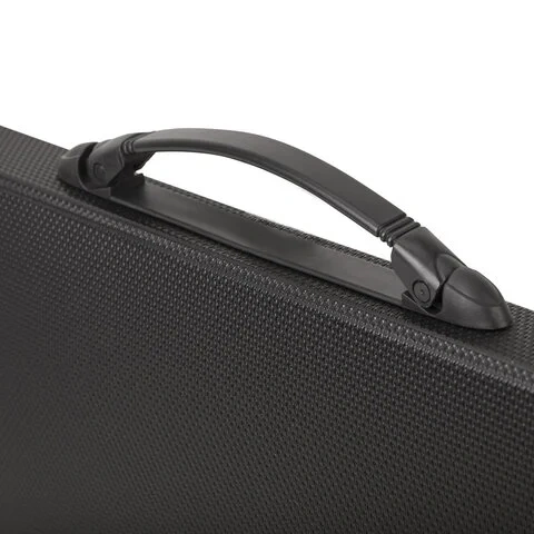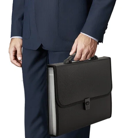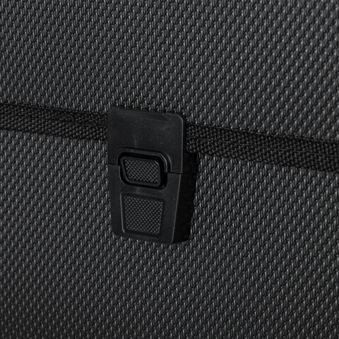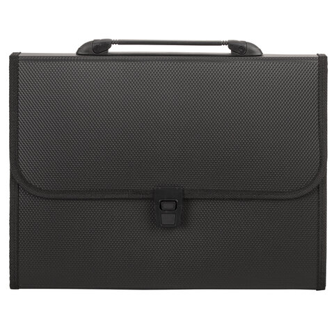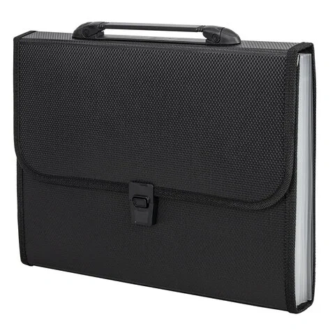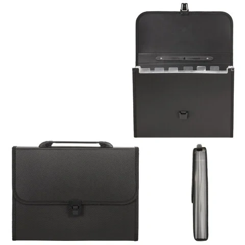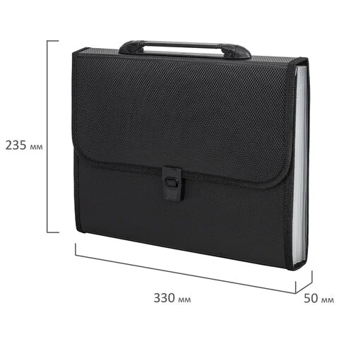 Портфель формата А4 (330x235x50 мм) изготовлен из пластика толщиной 0,9 мм, выполнен в черном цвете с фактурой 'циновка' и имеет 7 отделений. Складная ручка обеспечивает компактность изделия. Портфель застегивается на клапан. Края окантованы тканью с металлическими рейками по краям окантовки, что придает изделию презентабельный вид.