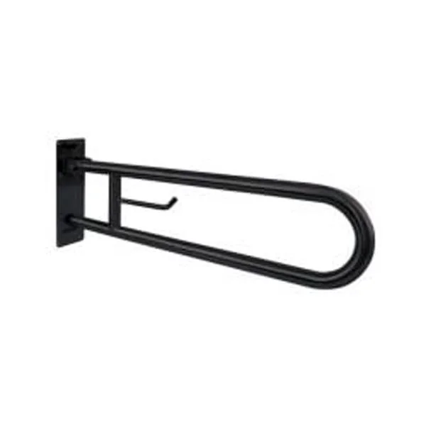 Поручень полукруглый для людей с ограниченными возможностями 800 мм из нержавеющей стали AISI304 чёрного цвета. С держателем для одного рулона туалетной бумаги. Полукруглый откидной поручень идеально подойдет для комплектации практически любого санузла для людей с ограниченными возможностями. Максимальная нагрузка на эту модель составляет 120 кг, поэтому производитель настоятельно рекомендует использовать в санузле также и другие пристенные поручни.