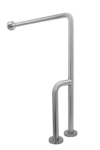 Поручень под 90 градусов матовый с настенным и двумя напольными точками опоры выполнен из нержавеющей стали матовый.