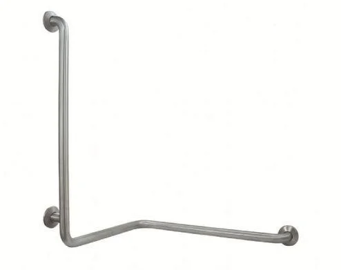Поручень для установки в угол с тремя точками опоры выполнен из нержавеющей стали AISI 304. Вертикальный поручень слева. Горизонтальный справа