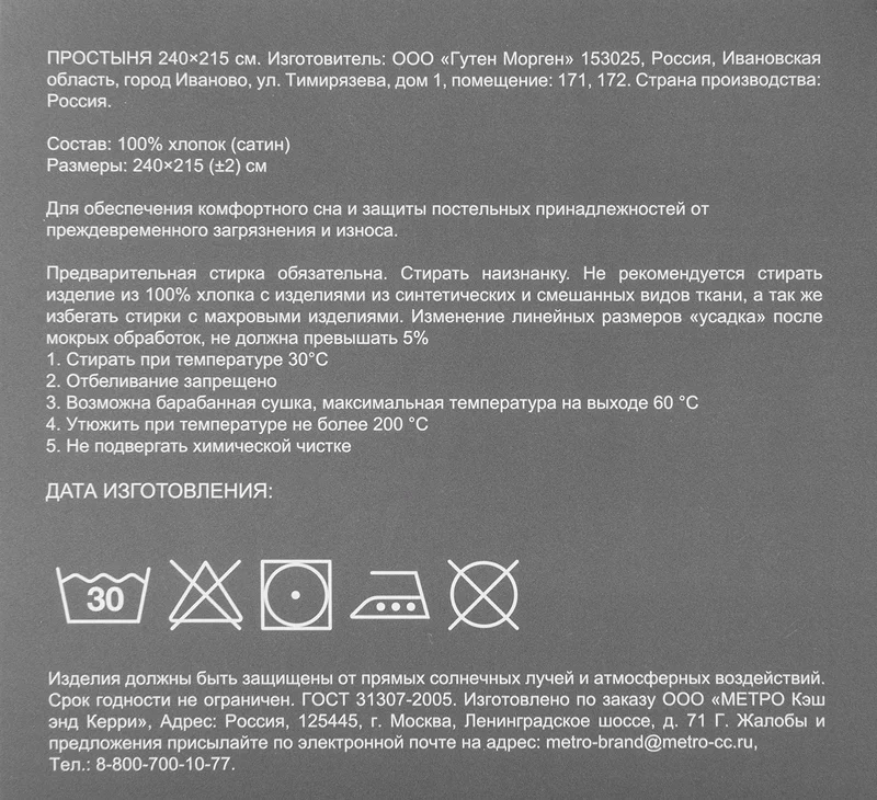 Tarrington House Простыня сатин темно-серая, 240 x 215см